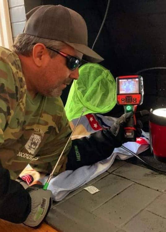 “This evening I received a report of a bird that was trapped inside a residence fireplace chimney. The RP stated that their cat alerted them to a loud fluttering noise inside their chimney but the homeowners were unable to determine the species. Michele Dodge and I responded and I was able to locate a Mockingbird with my remote inspection camera that was trapped deep inside the chimney. After a few creative attempts, we finally were able to rescue the Mockingbird by using an extension cord that was dropped through the top of the chimney from the roof. By the end of the rescue, I think I ingested more fireplace soot than the bird but was worth the effort to free the small bird. After a quick health evaluation, the bird had no obvious injuries so I released it unharmed to live another day. This rescue makes number 650 for the year so far which will surpass last years record breaking season.”