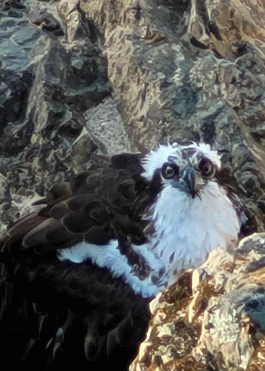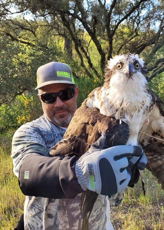 Today we received a report that some local kayakers noticed an injured Osprey in a remote canyon along the South Fork of the American River in Lotus, California. The Osprey was at the river’s edge near a famous landmark called Gorilla Rock and had a wing injury. Laura Morin and myself responded immediately. Due to poor cell and GPS reception of the remote location, we had difficulty at first finding the Osprey and it took us 2 hours of climbing through steep poison oak terrain. I decided to carry as little rescue gear as possible because of the rugged location. My ArmOR Hand Gloves were one of the few items that I brought with me. We finally found the injured Osprey next to the water but he was on high alert. I had the kayakers distract the bird while I snuck around a rock and was able to net him before he jumped into the river. Once safely captured, I had to hand carry the Osprey out of the steep rocky canyon. Laura and I then transported the injured Osprey to Gold Country Wildlife Rescue. I am grateful for the concerned kayakers and Stefanie who called us so we could help this beautiful bird. It will be a miracle if I don’t get a major poison oak infection after this rescue.