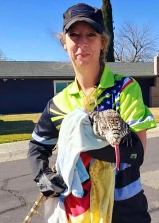 “For the past 2 days I’ve been getting reports of a large loose non native lizard called a Tegu roaming the streets of Folsom. Christina Sullivan and myself conducted a search this morning. We searched the area’s that the 4 foot long lizard had been seen. We covered a wide area and even found an abandon reptile aquarium that was in very close proximity of all the tegu sightings. It’s unknown if the large exotic lizard escaped its confinement or was illegally released or dumped. Tegu lizards are a large powerful species that can have a bite force of over 1,000 Newtons, a measurement calculation that is equal to a large breed dog bite. Also named after Sir Isaac Newton. The non native Tegu lizards are active during the day and can be very detrimental to our native wildlife. They can eat eggs and small animals. The State of Florida is experiencing an explosion of non native species that are negatively affecting their native wildlife. With the help of Christine Sullivan, DeAnn Wren and Folsom Animal Control, the large lizard was finally caught in a neighbors backyard today. Temporary housing will be made for a mandatory stray holding period so a possible owner can be found. This rescue is a victory for our native wildlife by removing it from the wild population.”