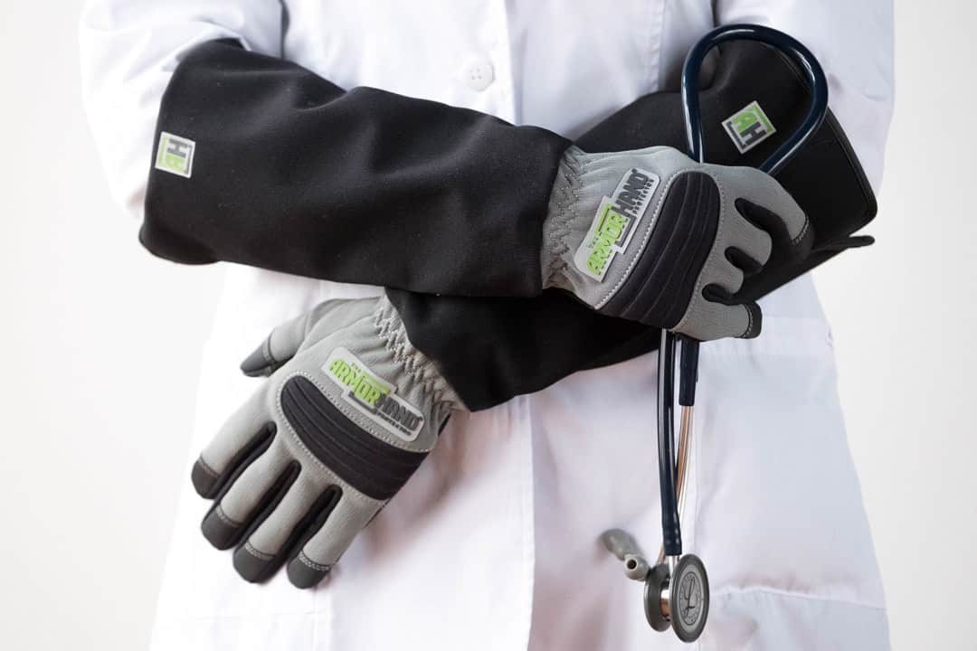 ArmOR Hand Protective Gloves are machine washable and are able to be wiped down to help decrease zoonotic and infectious disease transmission.